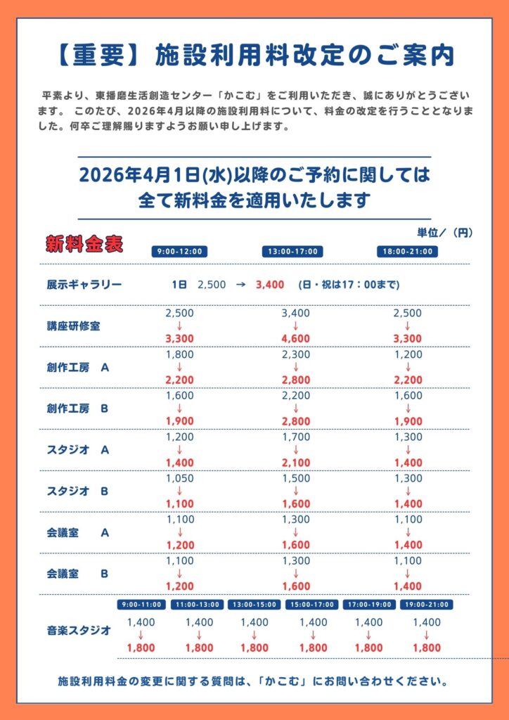このたび、2026年度4月以降の施設利用料について、料金の改定を行うこととなりました。