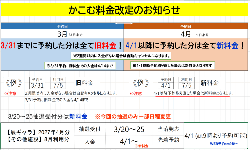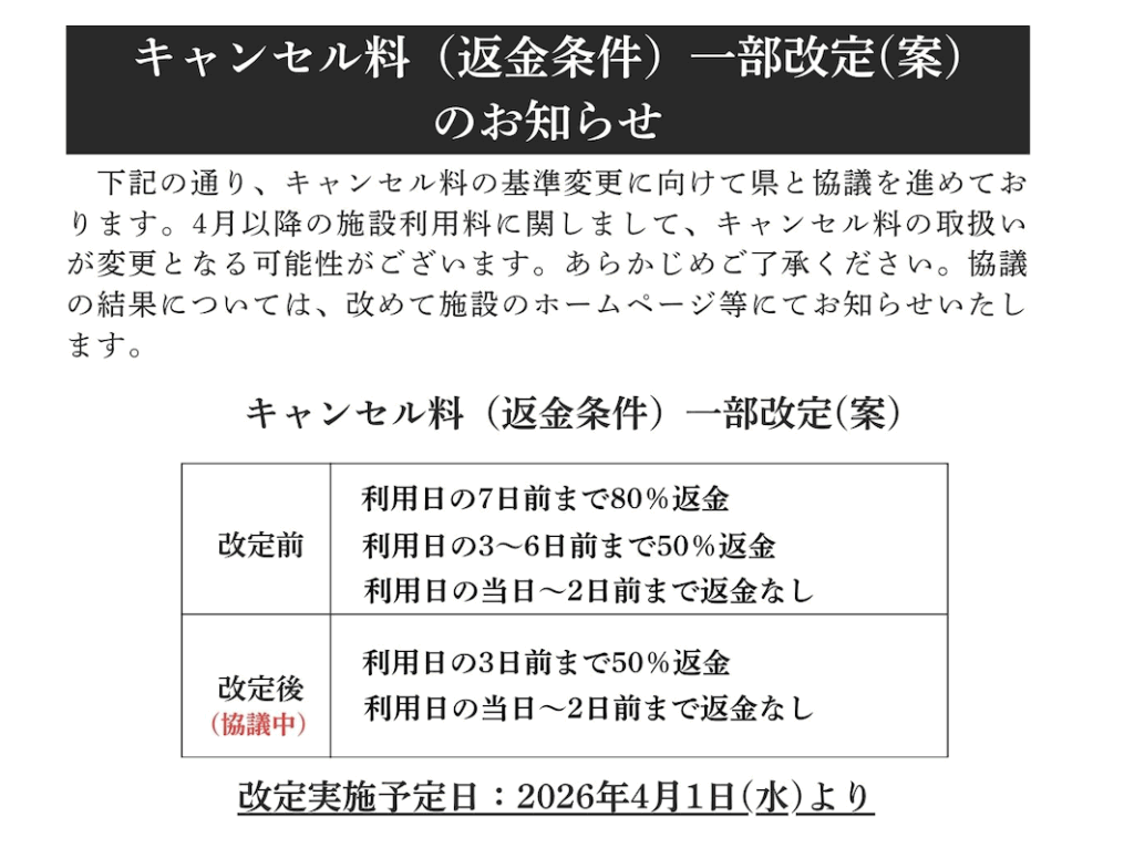 4月以降の施設利用料に関しまして、キャンセル料の取扱いが変更となる可能性がございます。あらかじめご了承ください。
