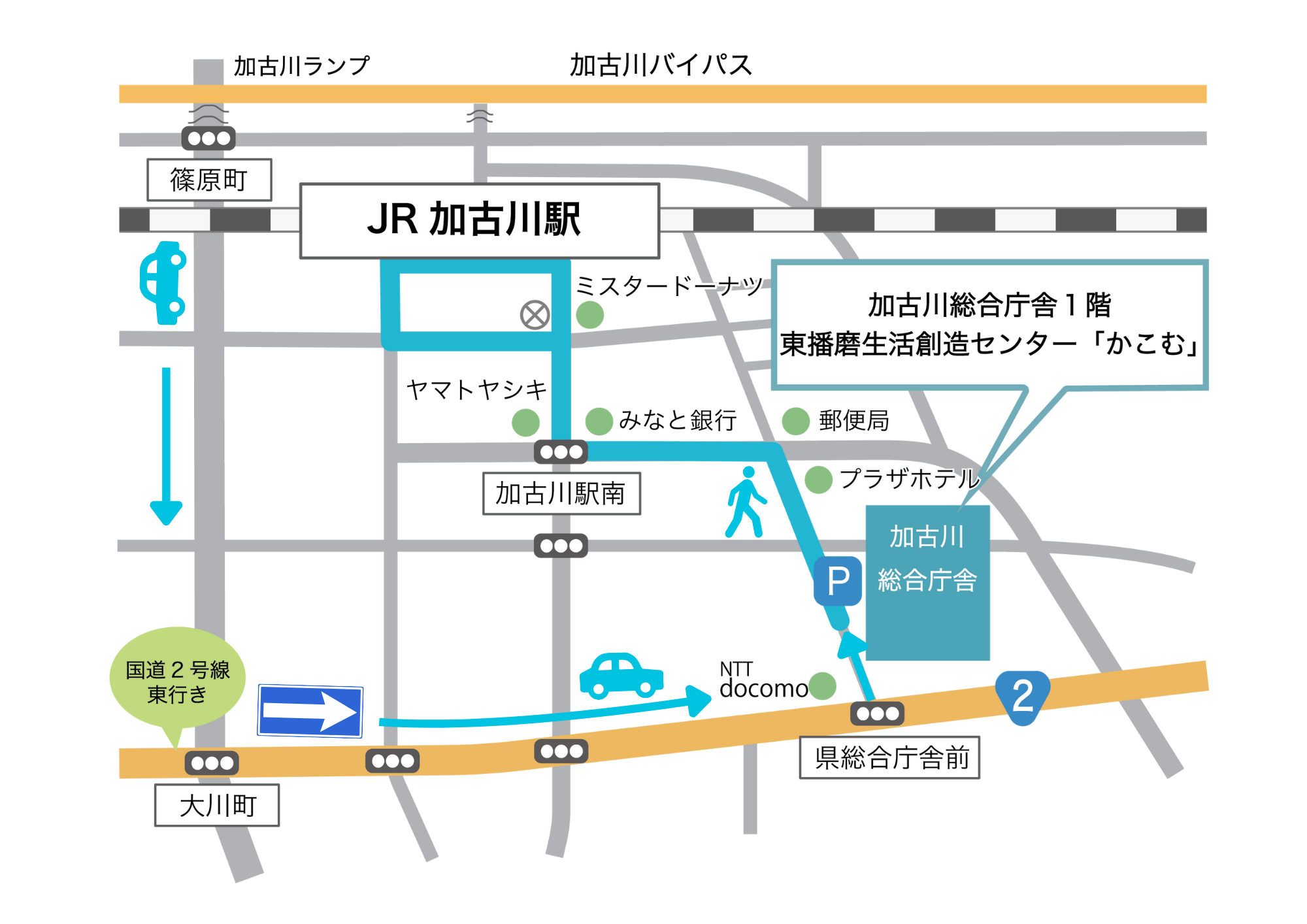 JR加古川駅南口より駅南中央道路を南下し、1つ目の交差点を左折、加古川プラザホテルの手前を右折して、約100m先左手