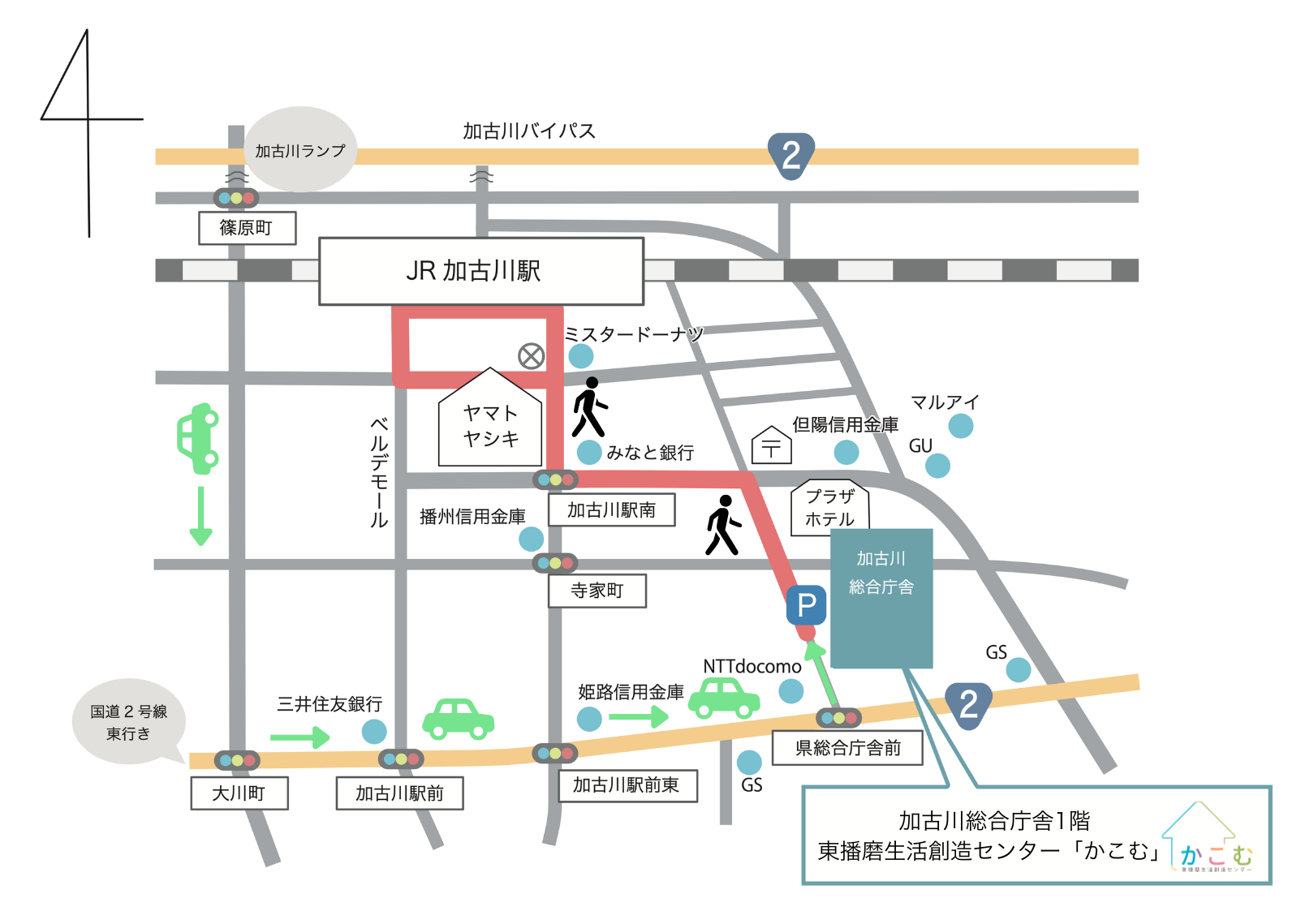 JR加古川駅南口より駅南中央道路を南下し、1つ目の交差点を左折、加古川プラザホテルの手前を右折して、約100m先左手