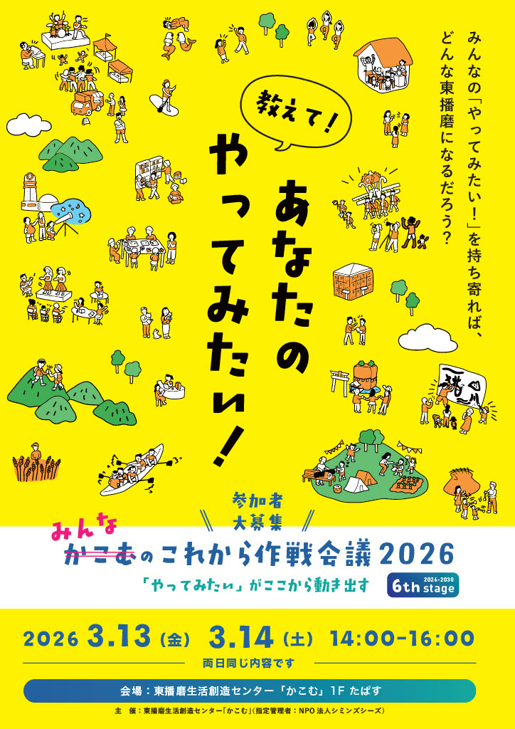 「やってみたいな」と思っていること、ありませんか? 思いつきでも、まとまってなくても大丈夫。この場は、みんなの「やってみたい」を出発点に、これからの「かこむ」、これからの東播磨を一緒に考える第0回の作戦会議です。「やってみたい」がなくても大丈夫。応援する、関わる、聞いてみる、そんな参加も歓迎です。ここから、次の一歩を見つけてみませんか?