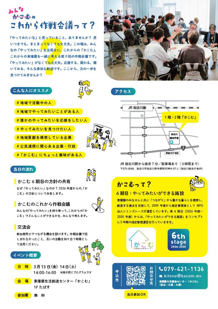 | 問い合わせ先 | 東播磨生活創造センター「かこむ」(担当:大福・大塚) TEL:079-421-1136 MAIL:kitene@kacom.ws |